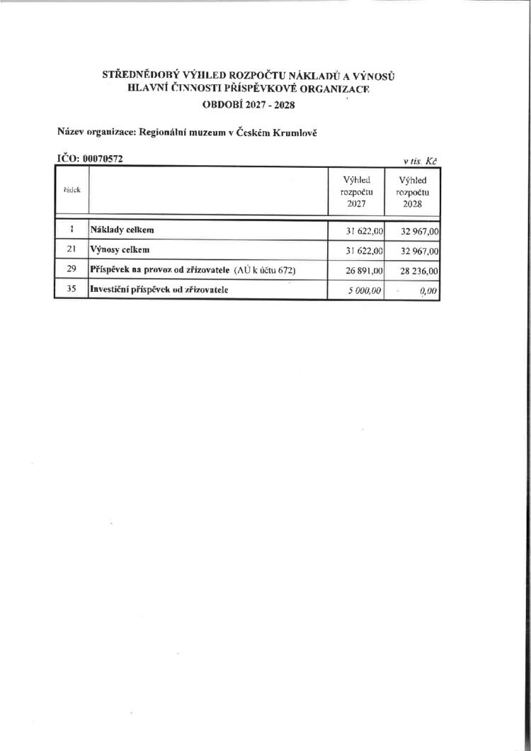 Střednědobý rozpočtový výhled hlavní činnosti příspěvkové organizace